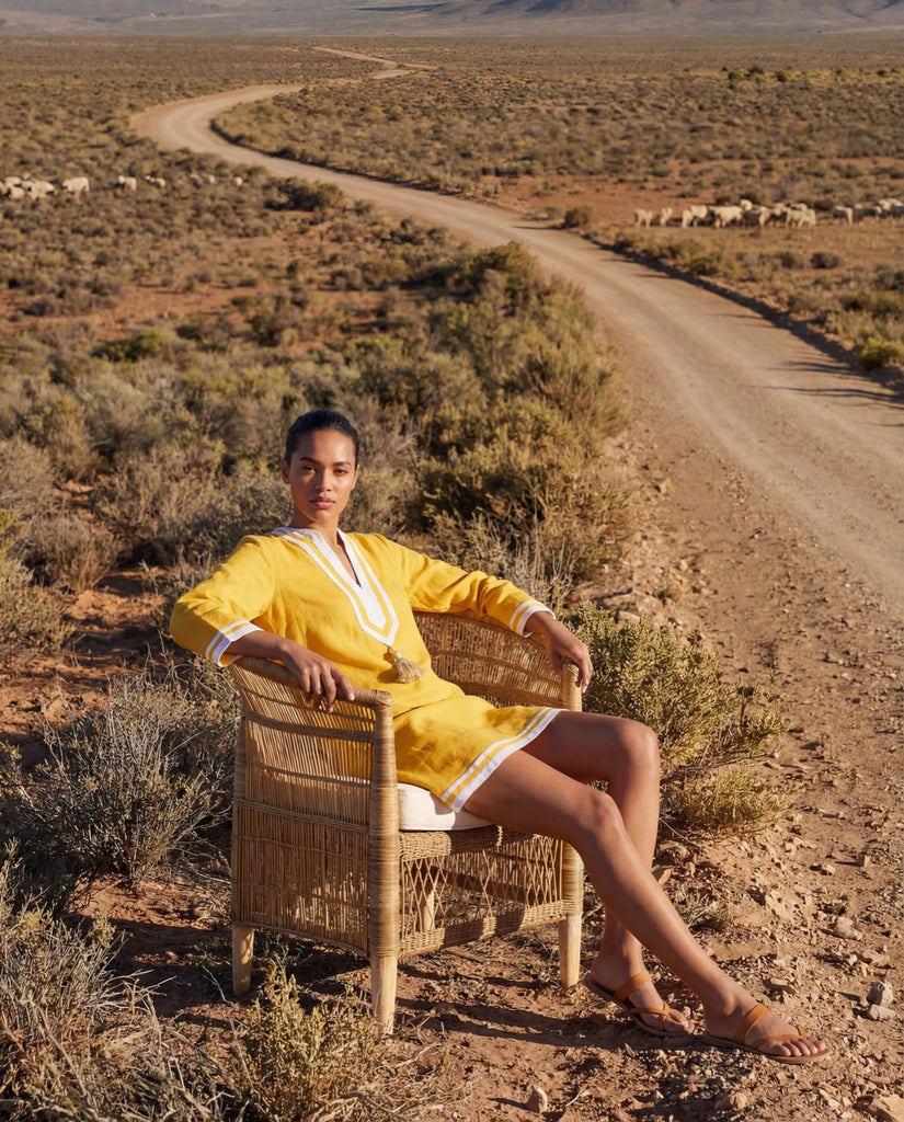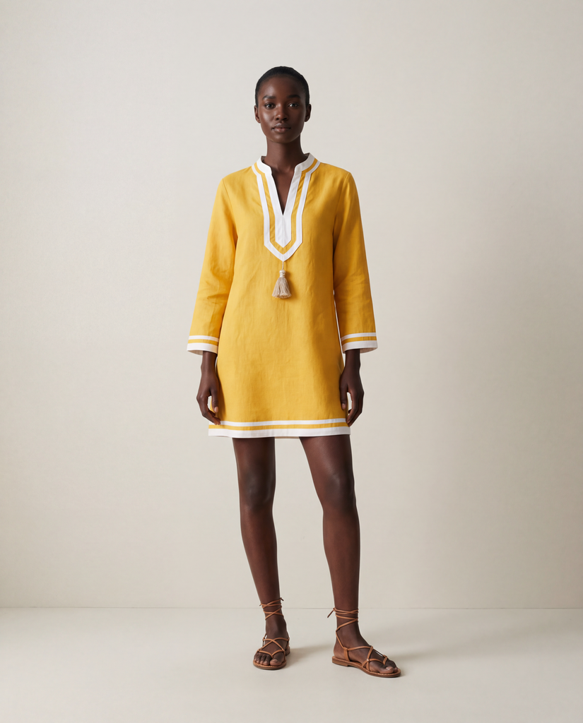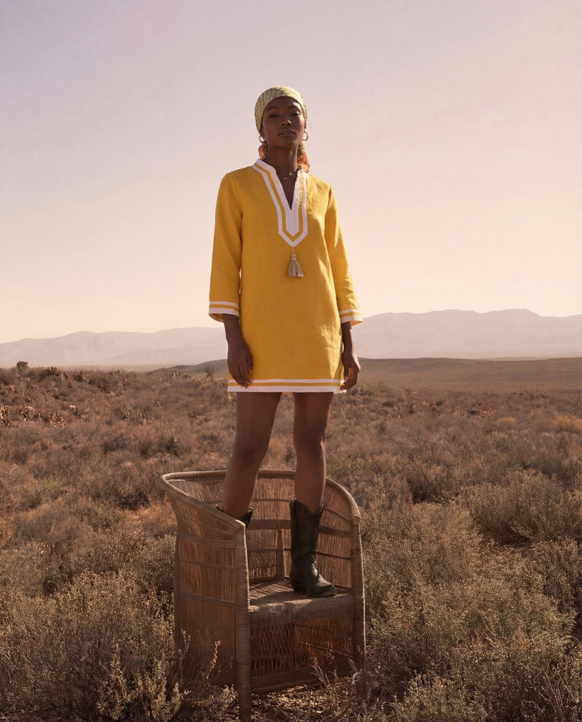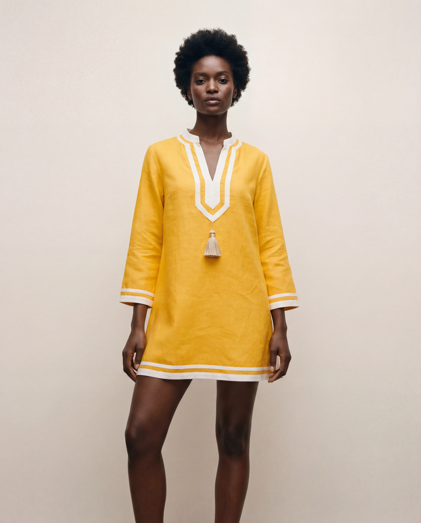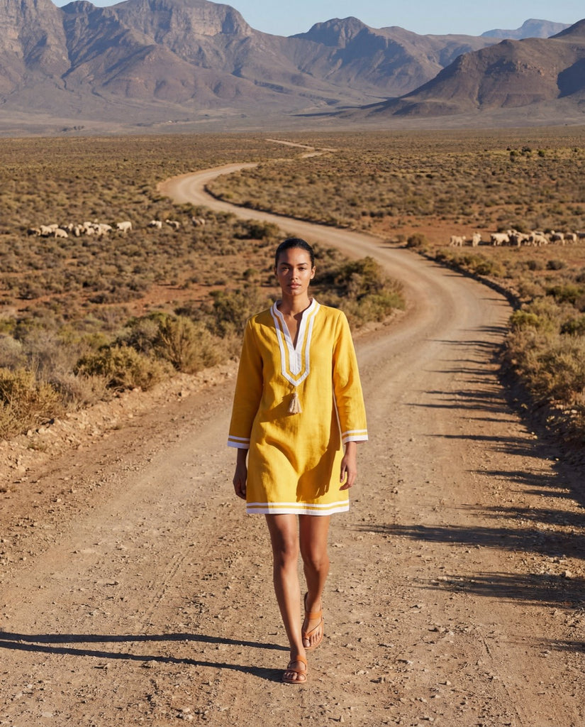 The "Kolkata Tunic" from Franki & Remi is made from light weight mustard cotton and features white piping along with white tassels. It’s shorter version of our original Kolkata Kaftan.