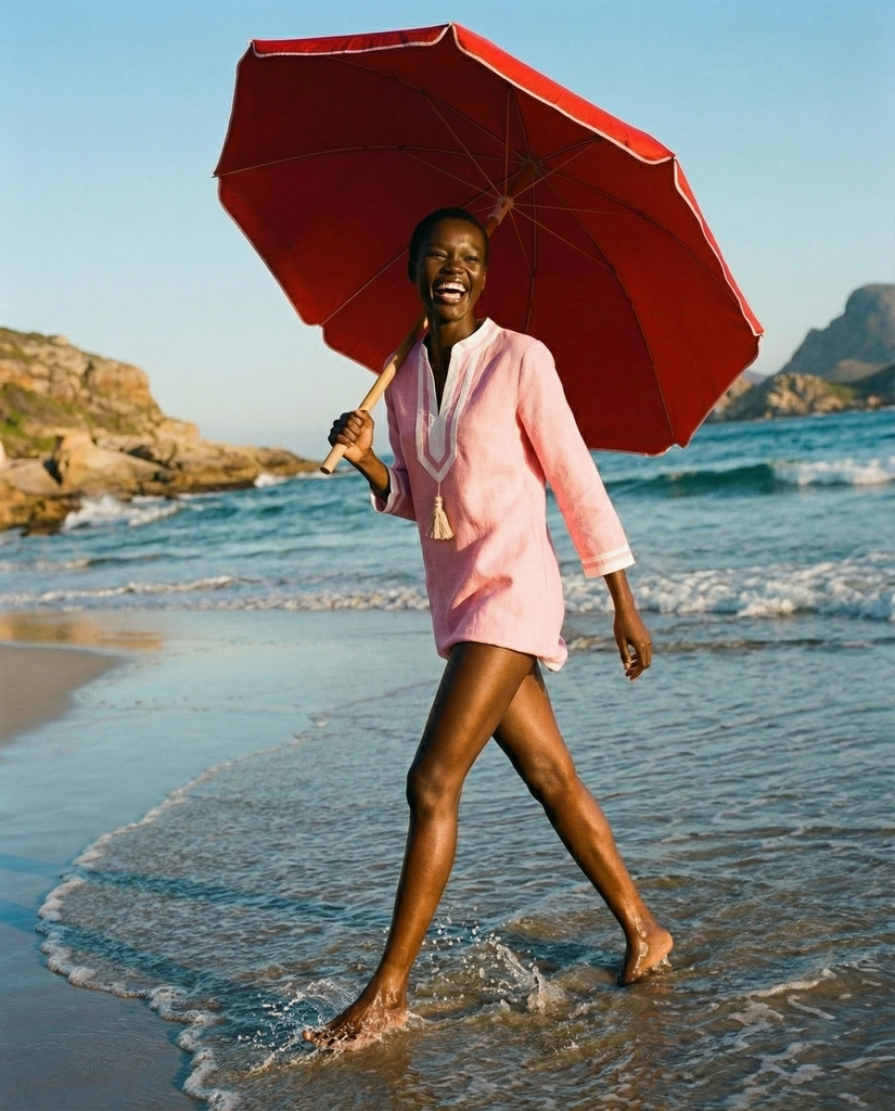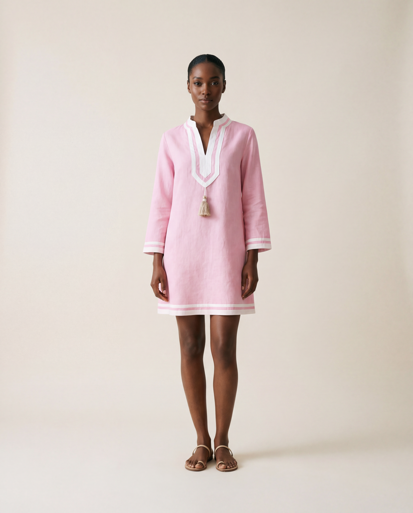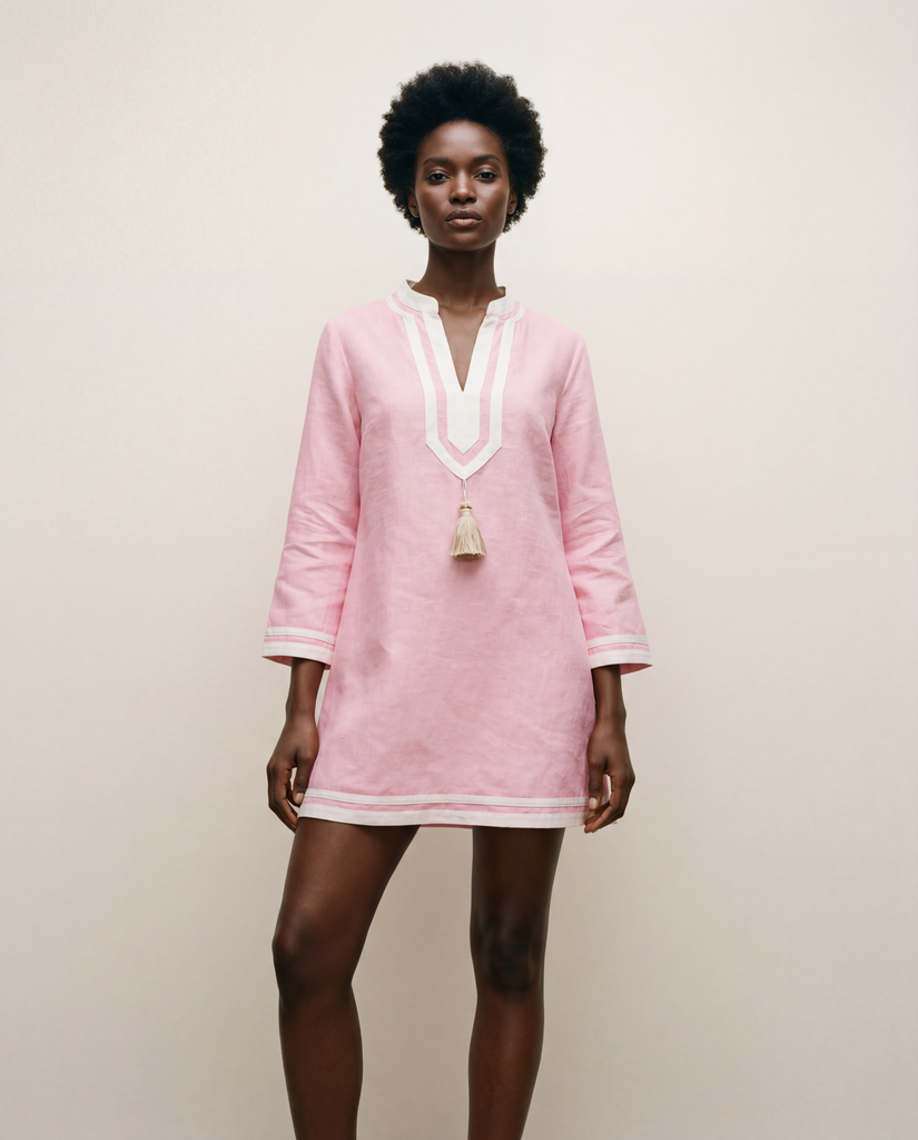 The "Kolkata Tunic" from Franki & Remi is made from light weight pink cotton and features white piping along with white tassels. It’s shorter version of our original Kolkata Kaftan.