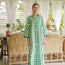 Make a bold statement in this striking kaftan, crafted from breathable pure linen. Featuring a vibrant green geometric pattern that feels both modern and timeless, this piece is finished with playful bubble trims along the hem and sleeves for a touch of charm.