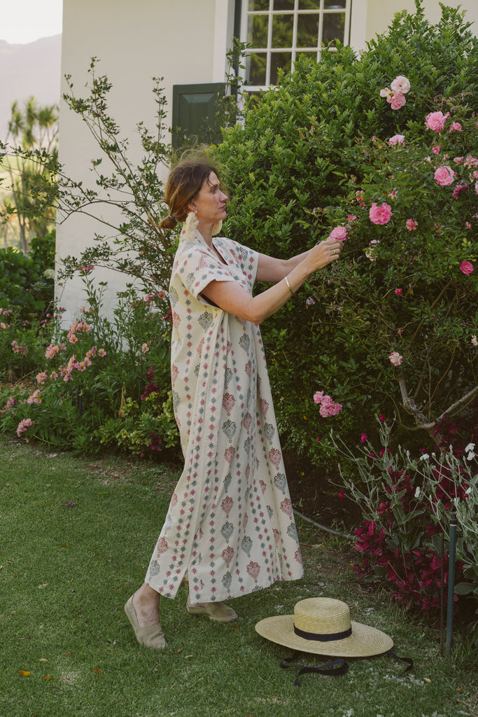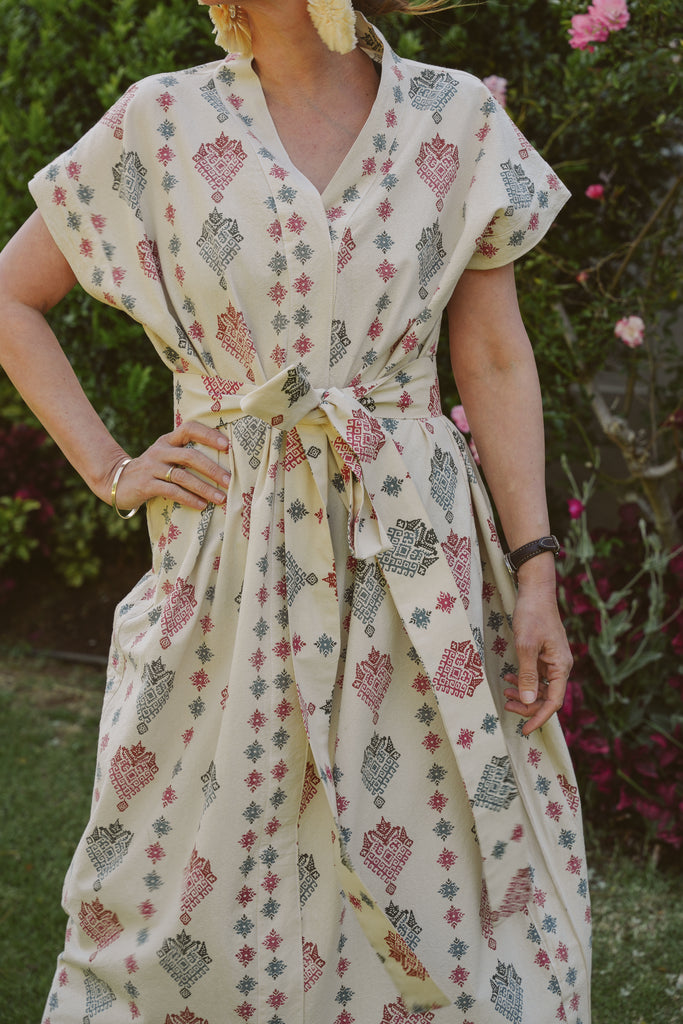 Crafted from soft,  cotton, the Syros Stripe Kaftan is the embodiment of effortless summer ease. Inspired by island simplicity and sun-washed days, its delicate geometric stripes add quiet texture and charm. The relaxed silhouette flatters every shape, whether worn with its matching belt for a defined waistline or loose and free for a laid-back, resort feel.