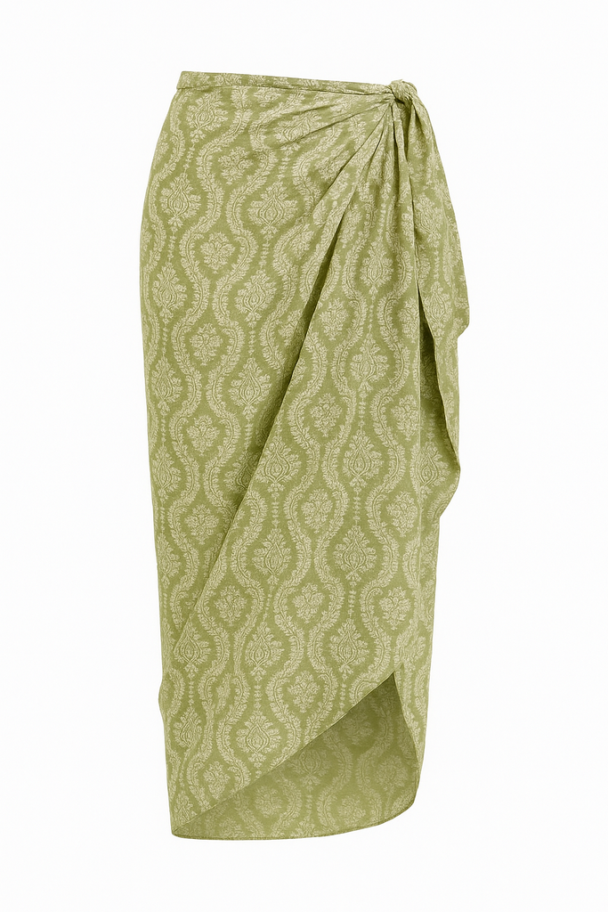 lA beautifully lightweight wrap designed for effortless, beach-to-lunch dressing. Cut from soft, viscose fabric in a sage-green ikat motif, this pareo drapes naturally around the body and ties comfortably at the waist. Wear it long, short, or styled as a dress — the versatility makes it an essential piece for summer.