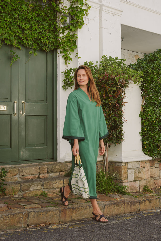 A timeless classic in soft checked cotton, this long-sleeve kaftan dress blends relaxed ease with understated elegance. Featuring a gentle A-line silhouette and a flattering open neckline, it’s designed to move effortlessly from morning coffee runs to seaside dinners.